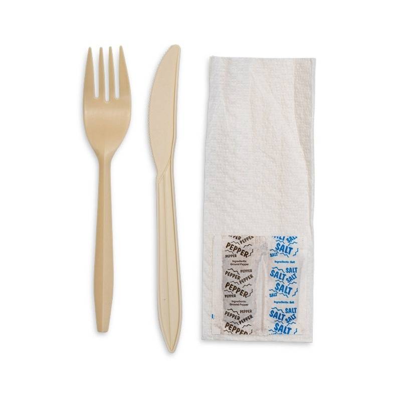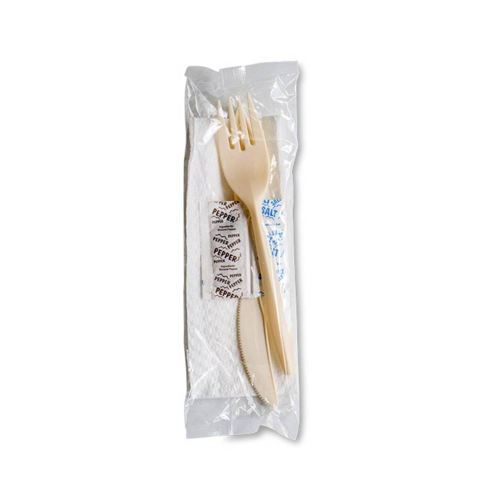 Includes knife, fork, serviette, salt & pepper in a clear bag